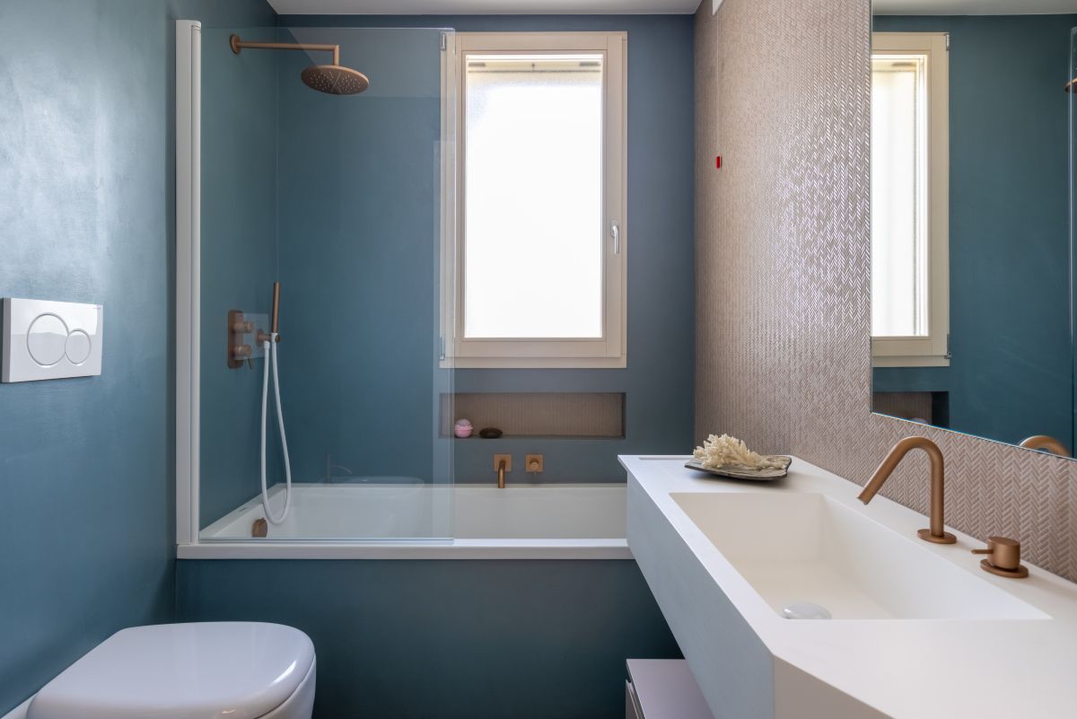 Vonios kambarys – galbūt drąsiausias kambarys minimalistiniame name – savo estetiką privalo Andrea metams, praleistiems Vokietijoje ir Italijoje dirbant Chipperfield. „Ten aš buvau artimai susipažinęs su rankų darbo medžiagomis, spalvomis ir formomis, kurios skyrėsi nuo tų, kurias buvau įpratęs matyti Bilbaoe. Šiame vonios kambaryje klasikinė šachmatų lentos koncepcija derinama su XX a. pradžiai būdingomis spalvomis ir italų metafizinių tapytojų, pavyzdžiui, De Chirico (iš čia ir arkos), įtaka.“ Šis pasirinkimas, nors ir ypač žaismingas, kontrastuojantis su dominuojančia balta spalva likusioje kambario dalyje, puikiai dera su bendru projekto identitetu. „Šiame name sambūvioja praeitis ir dabartis“, – sako García. Ir ateitis, galėtume pridurti.