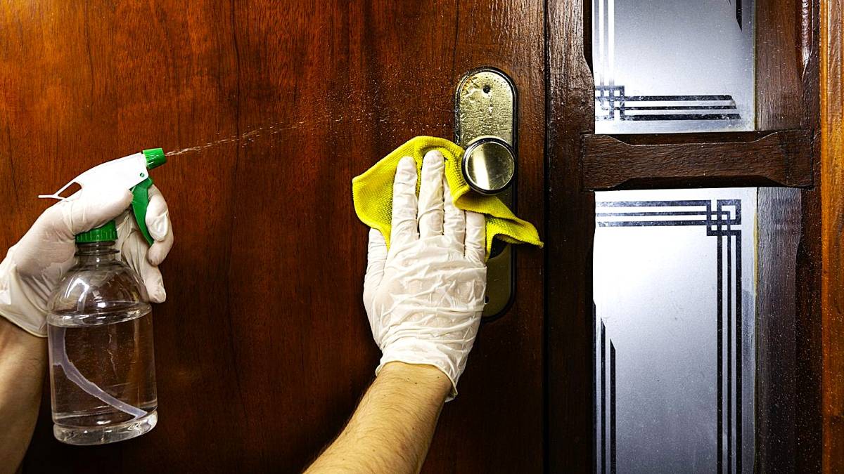 - Purkškite arba nuvalykite duris ir rėmą skudurėliu, ypatingą dėmesį skirdami apačiai ir kampams.