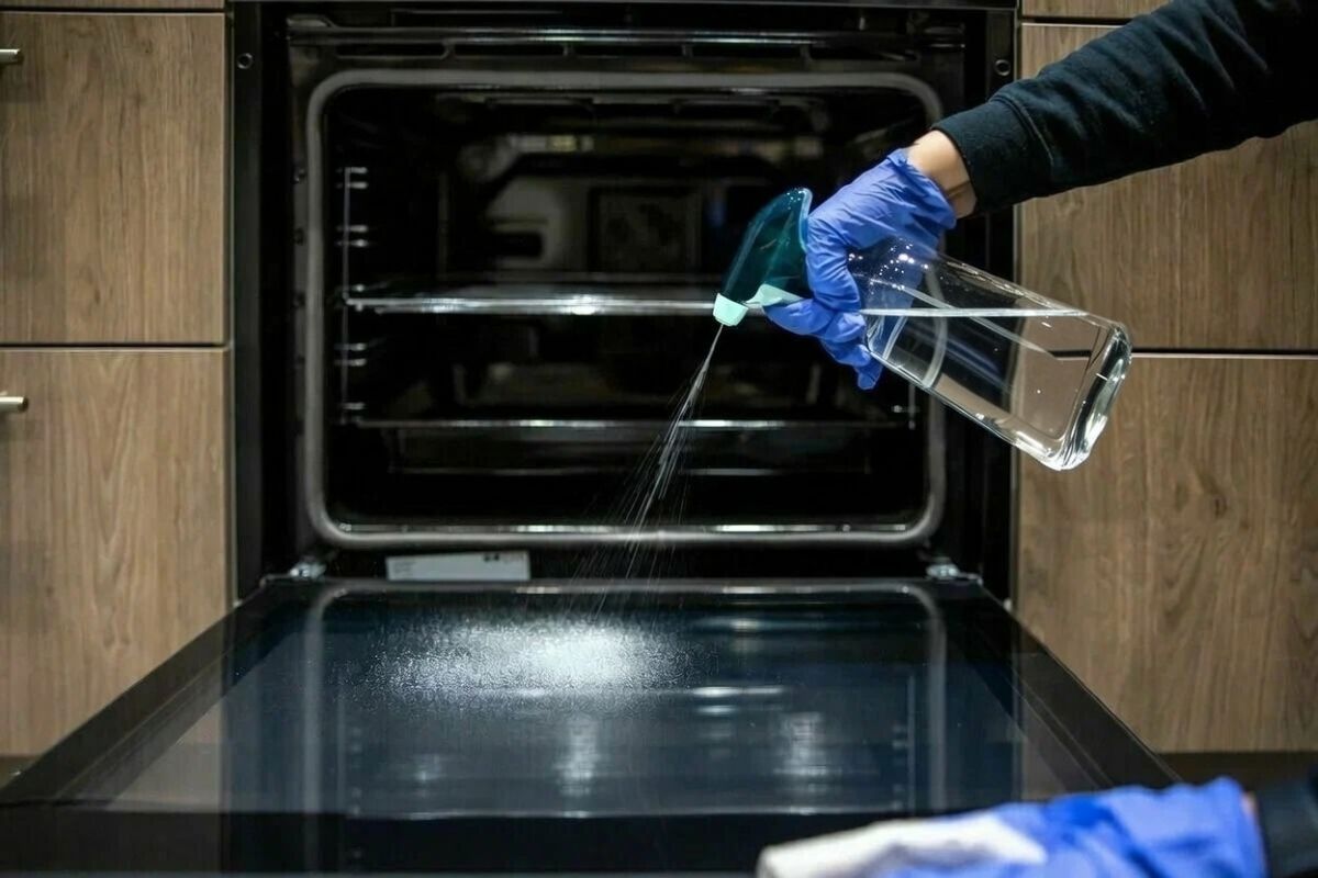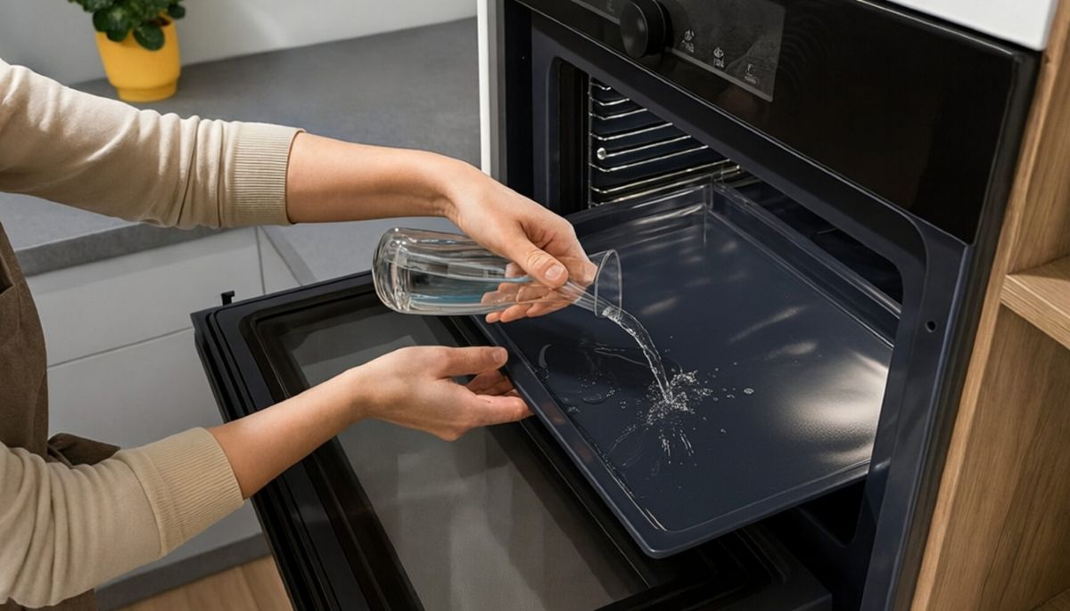 Jūsų pirmasis pagalbininkas yra garas. Įdėkite į orkaitę karšto vandens indą ir įjunkite vidutinę temperatūrą maždaug 10–15 minučių, kad iškepti riebalai suminkštėtų. Drėgnas karštis suminkština likučius ir palengvina jų pašalinimą vėliau.