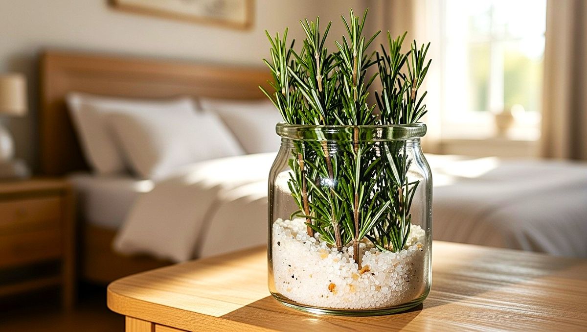Jo švelnus, gaivus aromatas padeda atsipalaiduoti prieš miegą, skatina protinį ramybę ir prisideda prie gilesnio ir ramesnio miego. Tuo pačiu metu jis valoma aplinką, sugeria nemalonius kvapus ir neigiamą energiją bei sukuria didesnį švarumo jausmą kambaryje. Kaip jei to nebūtų pakankamai, rozmarinas miegamajame atbaido vabzdžius, pavyzdžiui, uodus ir naktinius drugelius.