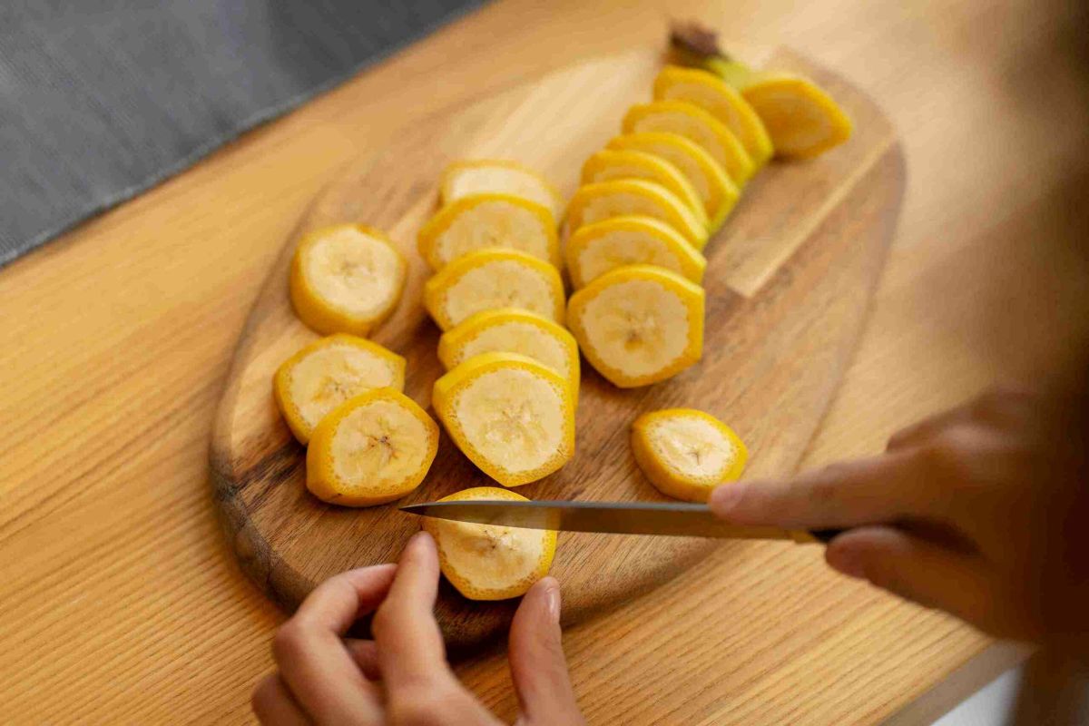 Pamirškite apie visų kekelių laikymą. Pirmas žingsnis – supjaustyti bananus gabalėliais. Tai gali atrodyti nelogiška, bet juos atskirdami ir supjaustydami, mes sumažiname stresą vaisiams ir palengviname jų laikymą stiklainyje.