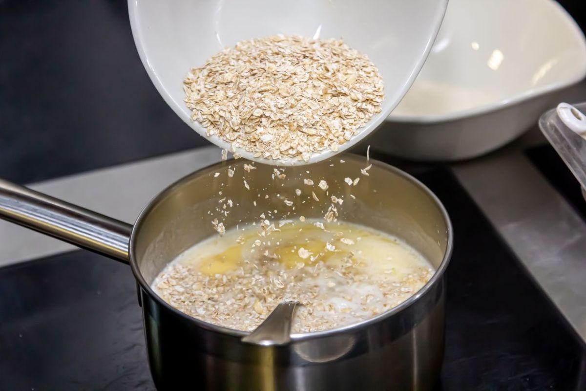 - Į puodą įpilkite pieno, avižinių dribsnių, supjaustytų obuolių, tarkuoto imbiero, cinamono lazdelės ir žiupsnelio druskos.